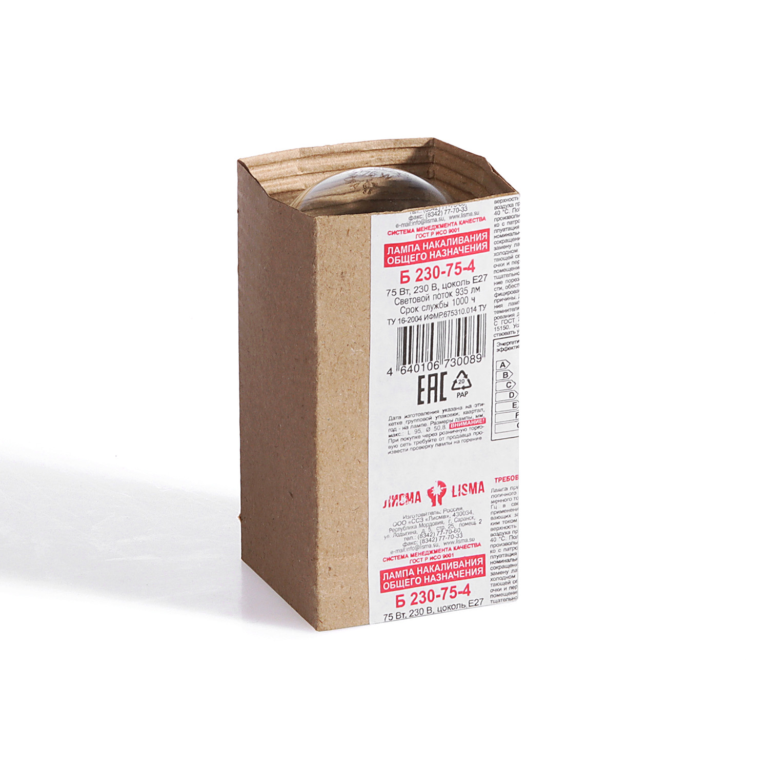 Лампа накаливания Лисма, Е27, груша, 75 Вт, 935 Лм, теплый белый свет