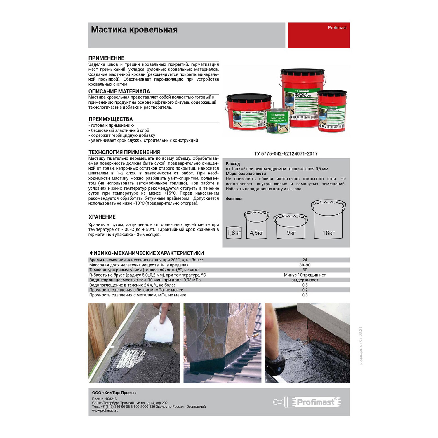 Мастика битумная кровельная Profimast совместима с большинством битумных и битумно-полимерных материалов, обладает густой консистенцией, не растекается в горизонтальных швах и трещинах. Не содержит толуола и других токсичных растворителей.