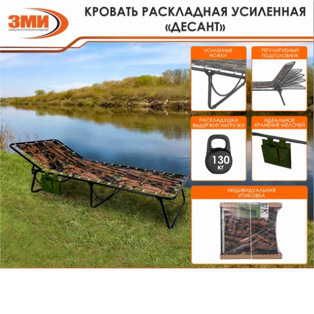 Раскладушка дл.2000мм,ш.750мм,выс.355мм Усиленная, максимальная нагрузка 130кг "Десант" (Соликамск)