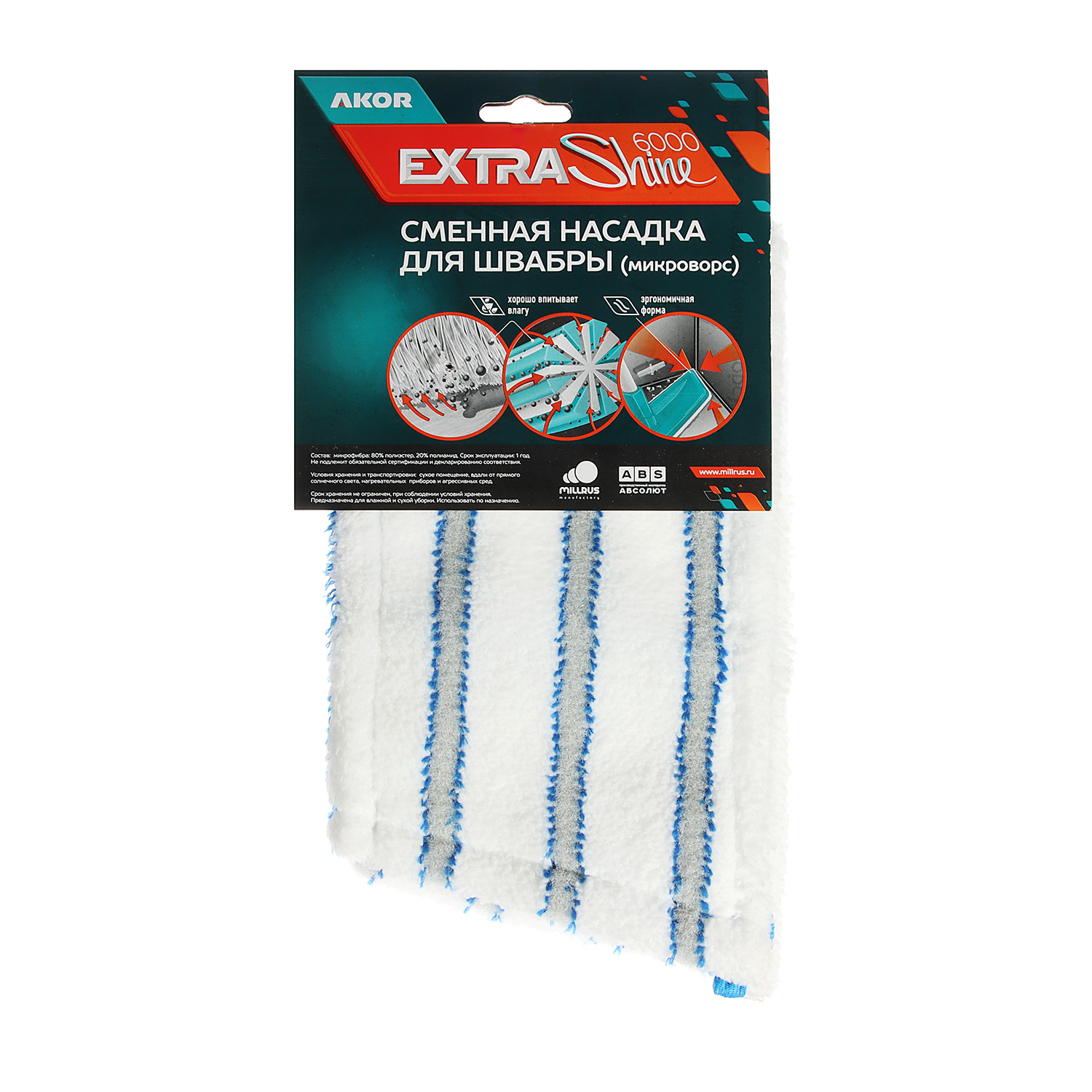 Сменная насадка для швабры ''Акор'' EXTRA-Shine 6000 микроворс. Насадка выполнена из микрофибры, из-за чего хорошо впитывает влагу. Модель хорошо скользит по полу и очищает швы, и другие структурные поверхности. Благодаря оптимальному расположению волокон обеспечивается качественная уборка.