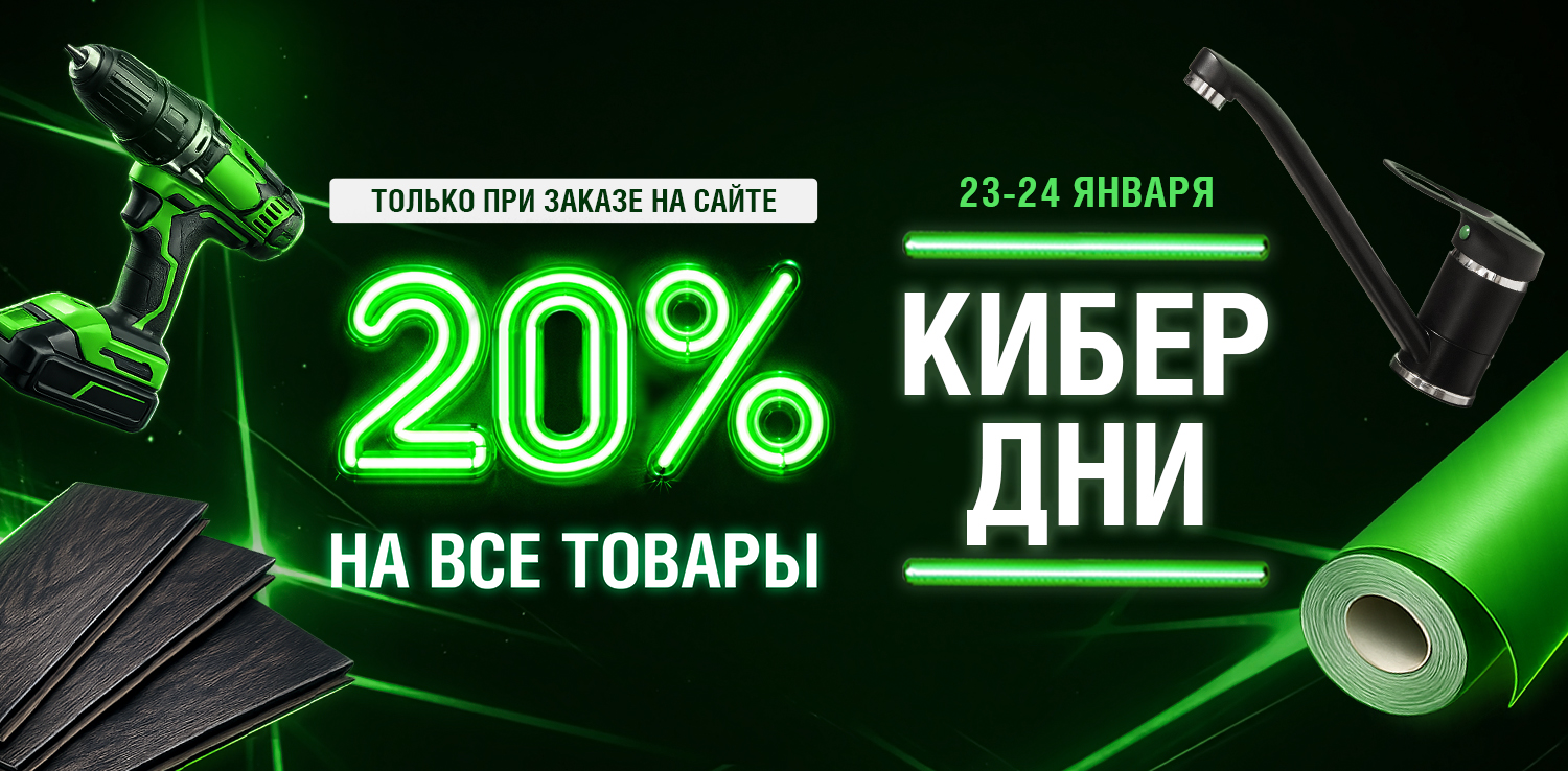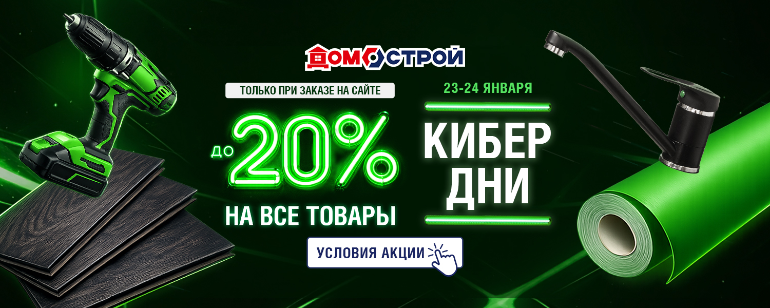 КИБЕРдни в сети ДомоСтрой! Только 2 дня — 23 и 24 января при заказе на сайте скидка -20% на огромный ассортимент товаров. Это отличная возможность приобрести напольные покрытия, обои, люстры, инструменты, двери, товары для дома и многое другое по привлекательным ценам! Оформляйте заказы в дни акции со скидкой и забирайте в течение 3 дней после.