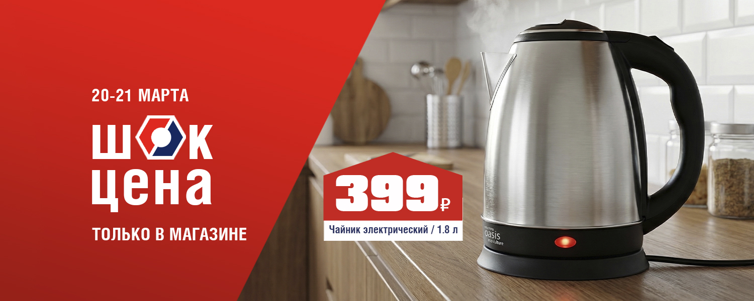 Цените каждую минуту? Этот чайник создан для вас! Мощность 2000 Вт и корпус из нержавеющей стали обеспечивают быстрое кипячение и долгий срок службы. Функция автоматического отключения гарантирует безопасность, а компактный объем идеально подходит для ежедневного использования. 20 и 21 марта в розничных магазинах ДомоСтрой не пропустите ШОК-цену: